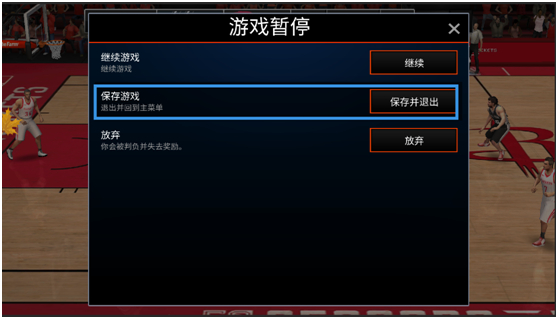 点击继续即为继续本场比赛,点击放弃则为放弃比赛,放弃比赛会判负并失去奖励哦。点击下载《NBA LIVE》