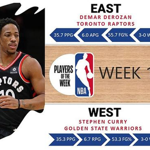 北京时间1月9日,据NBA官网报道,NBA官方公布了上周的NBA东西部最佳球员,猛龙队的德玛尔-德罗赞和勇士队的斯蒂芬-库里分别当选。