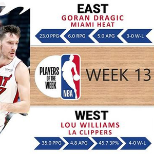 北京时间1月16日,据NBA官网报道,NBA官方公布了上周的NBA东西部最佳球员,热火队的戈兰-德拉季奇和快船队的路易斯-威廉姆斯分别当选。