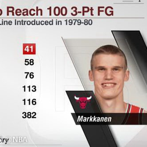 今天马尔卡宁投进了3记三分,这样在他职业生涯前41场比赛中投进了101记三分,刷新了联盟新纪录。