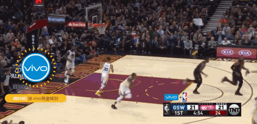 库里在一次防守中被詹姆斯撞到,然而在随后的一次进攻中,他就在距离篮筐34英尺外飙射,皮球划过一道完美弧线,直接坠入网窝。