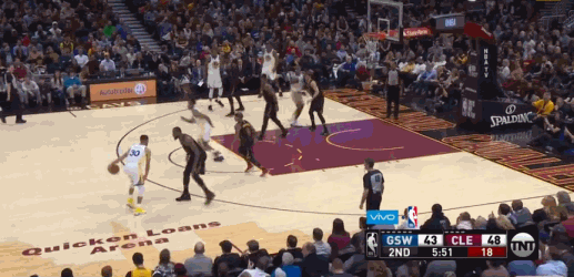 随着比赛的进行,双方进入轮换阵容后,库里逐渐开始主动进攻。次节5分47秒,库里持球组织勇士队进攻,但是面对勒布朗-詹姆斯的错位防守,他个人选择单打挑战对手。库里运球后的后撤步三分跳投,迎着詹姆斯长臂将球射进篮筐。
