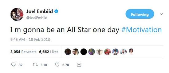 2013年2月18日,乔尔-恩比德在自己的个人推特上许下承诺:有朝一日我会成为一名全明星的。彼时,不满20岁的他还身披着堪萨斯大学的战袍在NCAA里披荆斩棘,这句豪言便是推动他前行的动力。