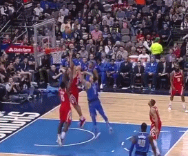 此时,肩并肩站在禁区里的鲍威尔和小牛队控卫史密斯同时起跳,而且一起高举双手并试图干扰卡培拉的传球。他俩的动作简直是神同步,非常有趣。