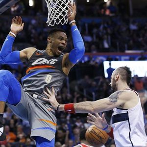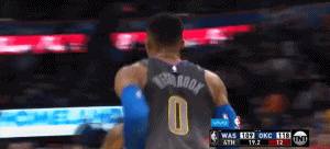 比尔回敬三分后,威少越战越勇。3分03秒威少持球强突,对手无奈只能一把将其拉下。1分16秒威少再演“暗度陈仓”,在吸引对方2员大将防守后溜底线到篮下,突然妙传安东尼爆扣得手,点燃全场激情。1分02秒奇才发球失误,威少再次一骑绝尘,快攻爆扣锁定胜局。终场前15秒,威少以一记三分为这波狂飙画下句点,兴奋的他还挥动手臂鼓动球迷。