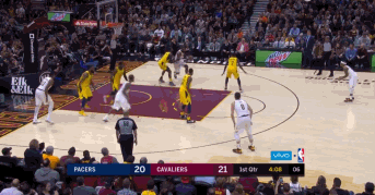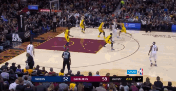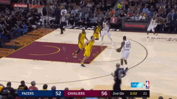 第二节末端詹姆斯错位单打科里森转身跳投压哨打进,虽然上半场詹姆斯仅仅收获10分但是他送出了6次助攻,助攻勒夫JR罗斯命中三分,助攻汤普森篮下得分,他的串联起到了至关重要的作用。