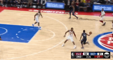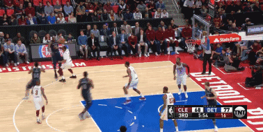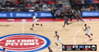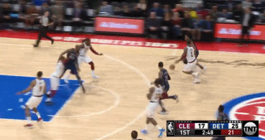 首节比赛进行至2分50秒,活塞队首发小前锋斯坦利-约翰逊快攻推进到前场,骑士的球员们虽然都退防了回来,但身处三分线内的四名防守球员几乎是看着约翰逊一个加速冲向篮筐上篮得分,只有克劳德象征性的伸了一下手。
