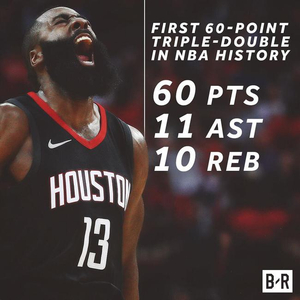 北京时间1月31日,火箭险胜魔术,在球队三大主力(保罗、阿里扎、戈登)缺阵的情况下,哈登一个人将球队扛在了肩上,他全场出战46分钟,30投19中,三分球14中5,罚球18中17,得到生涯新高的60分,并拿下了10板11助攻,这是NBA史上第一次60分三双。