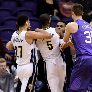 幸亏场上的其他球员和裁判迅速介入,从而避免让这场冲突升级。更有意思的是,掘金队的贾马尔-穆雷干脆把巴顿拽倒在地板上。[约基奇能否带队走的更远?竞猜NBA赢每日千元大礼]
