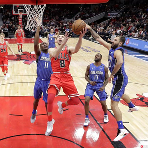 前三节两队打得很胶着。上半场魔术只以51-53落后。第三节几度战平,公牛一度取得两位数的优势,但也未能甩开魔术。本节最后2分钟公牛只得2分,魔术将比分追成71-77。