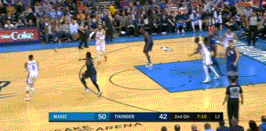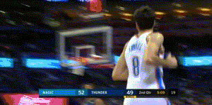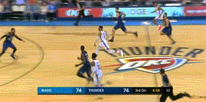 比赛中,威少屡屡为队友送出绝妙助攻。这一记利用自己的突破假意上篮抛投没想到经是给阿夫里内斯的一个精彩助攻,后者职业生涯罕见滑翔暴扣得手。