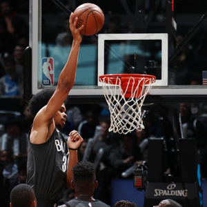 北京时间2月27日,篮网在主场以104-87战胜公牛。第三节,篮网首发中锋贾里特-阿伦隔扣公牛的大热新秀劳里-马尔卡宁。