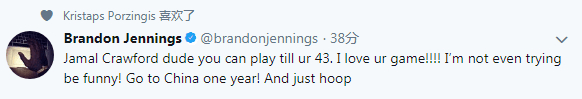 “贾玛尔-克劳福德我觉得你可以打到43岁,我实在是太喜欢你的比赛了,给我带来了无尽欢乐!去中国打一年比赛,展现出你的统治力。”詹宁斯这样写道。而且波尔津吉斯在看到这条推特后,点赞示好。