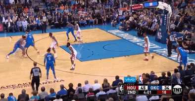 上半场还剩不到1分钟,安东尼抢断哈登,随后乔治和安东尼2打1快攻,安东尼接到乔治的传球之后篮下出手,虽然第一投不中,但是他抢到进攻篮板,并完成补篮。
