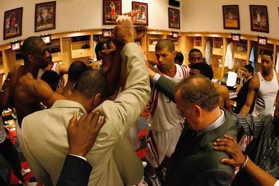 比赛之前的球员通道上,火箭全员头靠着头,手搭着手,他们已经习惯依靠在一起获得能量。为了姚,我们赢下去,这句口号声音响彻通道。