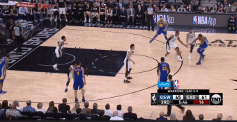 第三节还剩6分多钟,麦基从弧顶三分线外持球突破篮下,他在禁区内用一个小欧洲步晃过马刺的防守球员,然后在篮下完成一个低手上篮。