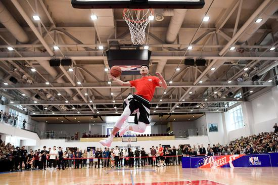 在NBA中心的另一大特色之一的NBA球场举行的扣篮大赛也为嘉宾奉上精彩连连,四位从高手如云的扣篮高手中脱颖而出的选手,为来宾带来纷呈的经典扣篮大赛。其中,来自Air_China扣篮团队成员、素有“东北第一扣篮王”之称的初贺,凭借零度角3分线助跑,快到蓝底跳起,一个单手背扣,赢得全场阵阵惊呼,连“得分王”多米尼克-威尔金斯都为他亮起了满分。