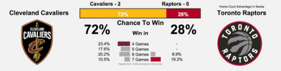 北京时间5月3日,今天克利夫兰骑士在客场以128-110大胜多伦多猛龙,取得总比分2-0的领先,猛龙主场优势荡然无存。最新的BPI结果显示,骑士晋级的几率已高达72%,甚至4-0横扫晋级的几率竟也达到23.4%。