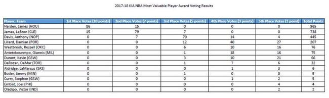 值得一提的是,今年MVP评选中只有哈登和詹姆斯获得了第一名选票。