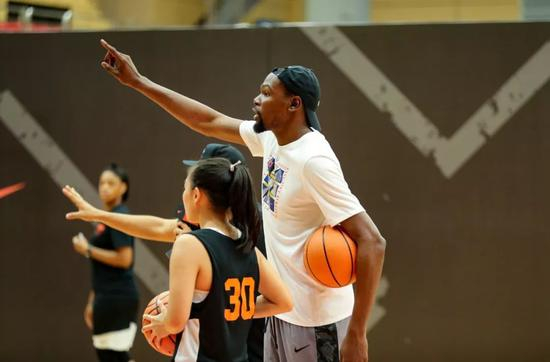 在RISE ACADEMY训练场上,杜兰特依旧保持着专注。与昨天不同的是,这次是男女球员一同参与的混合练习。