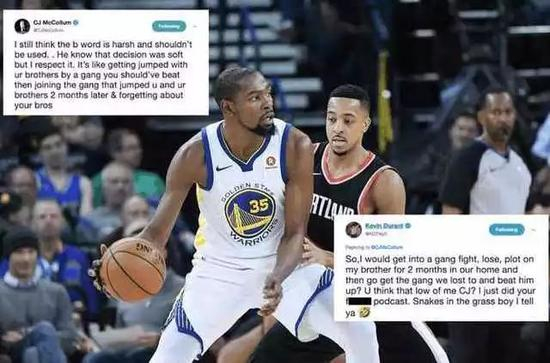 杜兰特与各路人马在社交媒体上公开互怼,其中既有普通网友,但也不乏NBA球星们。但无论杜兰特怎么在网上发布言论,都无法阻挡潮水般的质疑声。日前,杜兰特就与开拓者队球星C.J。-麦科勒姆结下了梁子,两人原本是关系尚可的朋友,但现在却产生了不小的隔阂。