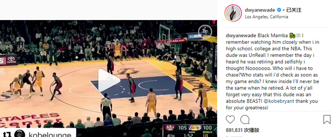 北京时间8月23日,据美媒体报道,德维恩-韦德今天在IG上晒出一段科比的比赛视频,并且向这位传奇巨星致敬。[没内存都不删的NBA手游!你爱的球星都在这]