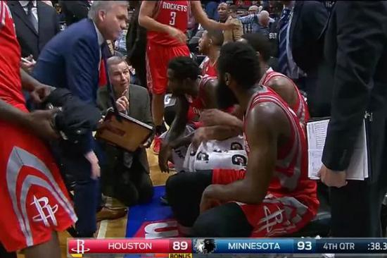 在火箭与森林狼比赛中跪地给球员们布置防守任务