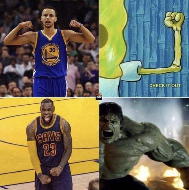 两位不同风格的运动员,在庆祝动作上的对比,成为媒体关注的焦点。库里的小肌肉被比作了海绵宝宝,骨瘦如柴的形象,让勇士球员看到后可能一时间很难接受。因为之前有消息透露,库里的卧推一直都在球队排前列。而詹姆斯的肌肉线条,则被绿巨人的形象所替代,威风八面、大气凌然。
