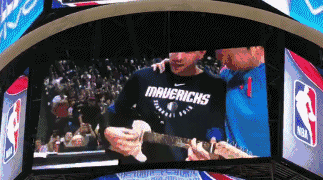 今年NBA中国赛,诺维茨基随独行侠来到中国。今天这场比赛第三节的一次暂停中,王治郅和德克-诺维茨基这对昔日的队友一起上场,而大致送了一把吉他给诺天王。得到这个礼物之后,诺天王在现场就弹起了吉他,随后他和大致握手致意。