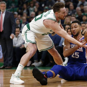 本场比赛开始后,西蒙斯频频冲击凯尔特人的篮下并得手。第一节还剩4分多钟,西蒙斯快攻中从两名防守球员的中间穿过并完成上篮。本节还剩1分多钟,西蒙斯再次发动快攻,这次他顶开贝恩斯的防守上篮得分。