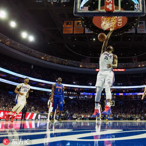 第二节打了不到2分钟,德拉蒙德又一次对恩比德犯规,只得再下场休息。恩比德又开始个人的表演秀,篮下得手,罚球,中投,三分,他无所不在。双方差距一度达到24分。半场结束时,76人以69-47领先。