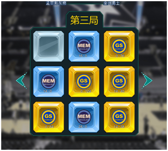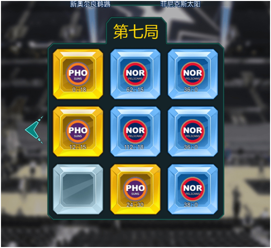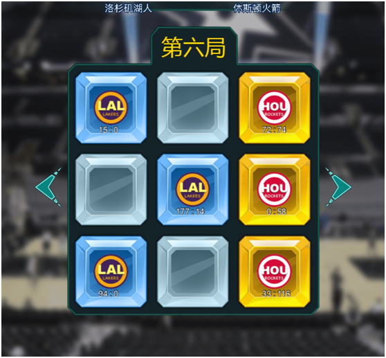 举例:球迷“詹姆斯”代表湖人队,选择了第二排的三个格子,每个格子各点了1次,球迷“韦德”代表热火队,同样选择了第二排的三个格子,每个格子各点了2次,则本局第二排的三个格子归球迷“韦德”所代表的热火队所有,本局热火队形成了第二行的横向三连,得到1分,本局的最后得分就是湖人0-1热火,热火队赢得此局。
