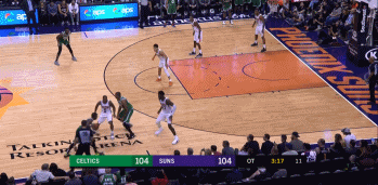 欧文持球跟霍福德在左侧45度打挡拆,艾顿想上前延误,但是他出现的位置过于靠外,直接将球场左侧的空间全都让给了霍福德,欧文出球,霍福德接球吸引了布克的补防,再分球,导球,两次传球之后,机会出现在了底角的布朗身上,抬手三分命中。