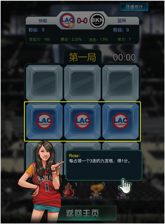 进入比赛后,我们会看到一个九宫格。每一局,比赛双方的所有球迷对九宫格进行争夺,本局结束时按照双方的总攻击效果,而不是个人的攻击效果,对格子进行结算。如连续3个格子被同一球队占据,则该球队获得1分。分数高的球队获得本局胜利。