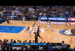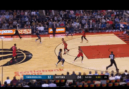 这个回合很明显,罗斯从右到左变相后,先靠住对手再起三步,不需要跳多高,对手也很难封盖。