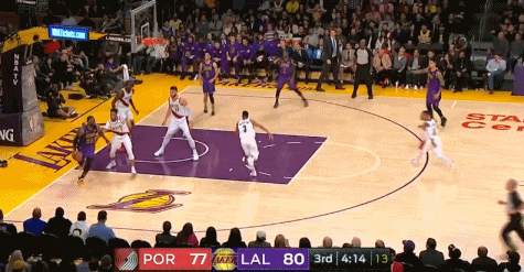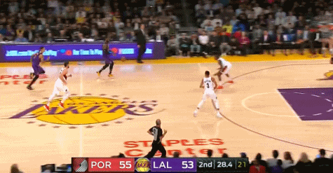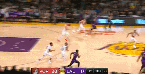 第三节詹姆斯开始频繁的往篮下进行冲击,这是本赛季非常少见的现象,其中第三节还有2分38秒,他先是协防过来封盖纽基奇的进攻,回过来又是上篮得分打停了开拓者。