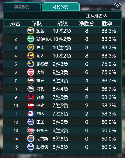 经过十二天比赛,积分榜已经拉开距离,如真实比赛一样西强东弱,凯尔特人一枝独秀以10胜2负的成绩登顶东部第一,而反观西部则是勇士、掘金、湖人并列第一,难分高低。