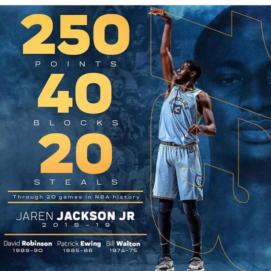 万金油般的风格是杰克逊最大的标签。生涯前20场比赛,他与名宿相提并论,一共交出了253分20抢断42盖帽,成为历史上该三项数据“250+20+40俱乐部”的第四人,另外三位是比尔-沃顿、帕特里克-尤因以及大卫-罗宾逊。此外,杰克逊单场7盖帽也是队史记录,算上昨日的单场36分,把3J称为灰熊的“现象级新秀”毫不为过。
