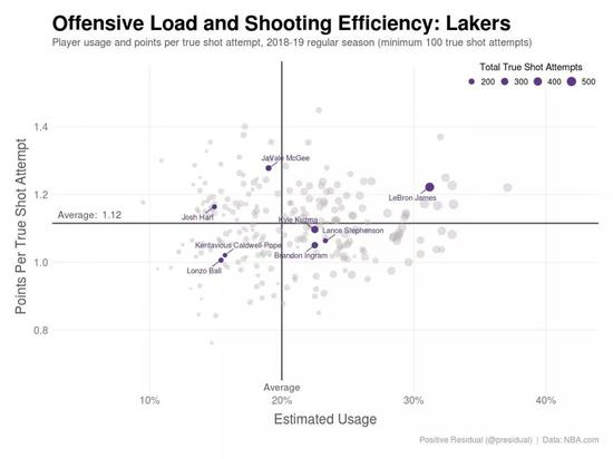 在进攻效率上,詹姆斯独领全队,一人全力支撑起了球队的进攻体系,湖人目前阶段想赢球,说来说去还得靠詹姆斯打出MVP级别表现才成。英格拉姆和鲍尔,现阶段都是有硬伤的球员,他们在新的湖人体系中没了去年的绝对球权,偏偏两人的无球能力又都比较糟糕,在开赛阶段,詹姆斯曾试探性的释放球权在某段时间给英格拉姆掌权,却发现他低效的持球进攻水准暂时还达不到让球队赢球的目标。没办法,还是自己来吧。