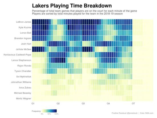 通过上面这张湖人每个球员在每场比赛每分钟的频率图,我们可以看出詹姆斯大多数时间没和哈特一同搭档,可是根据数据,詹姆斯和哈特搭档的311分钟里,球队百回合净胜对手8.6分,比他和湖人其他三少的净胜分都要多很多。湖人上场时间超过150分钟的三人组合中,詹姆斯/鲍尔/哈特百回合净胜对手9.2分,詹姆斯/哈特/库茨玛百回合净胜对手10.1分,分别是三人组中的第一和第二位。
