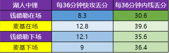 麦基每36分钟快攻丢12.8分全队最高,钱德勒在场时候球队内线丢分全队第二低,就比基本垃圾时间的比斯利分数低一点,谁对球队防守端的影响力更大, 一目了然。