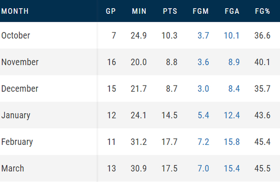 上赛季的杰克逊,场均13.1分入选了最佳新秀二阵,而且他的表现随着赛季深入是逐步提升的。2月和3月他已经可以稳定的45%命中率拿下17分了。