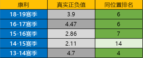 好在我们还有别的数据去证明他的稳定。除了因伤没怎么打的上个赛季,我们可以看看康利最近五个赛季真实正负值在控卫中的排名。