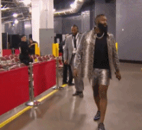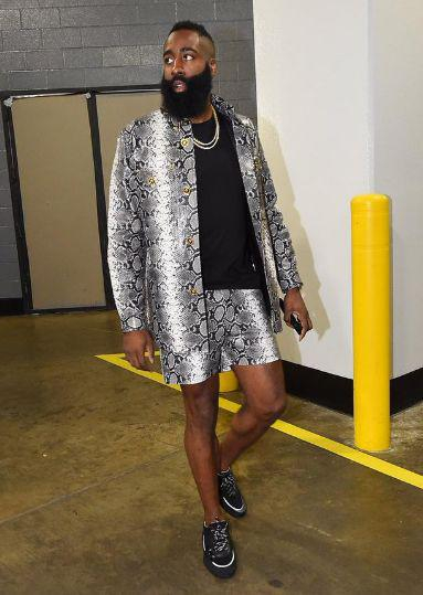 哈登的队友们裹得严严实实的来上班,哈登却穿个大裤衩晃晃悠悠就出来了,简直没把休斯顿的12月当冬天。
