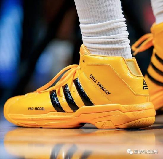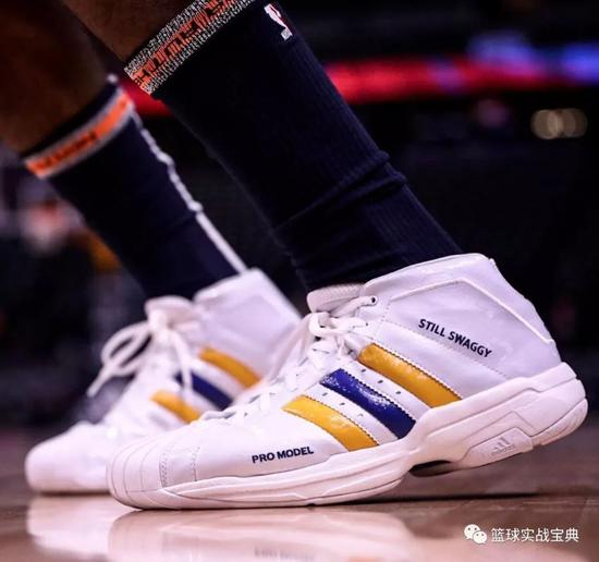 第二场对阵雷霆的比赛,尼克-杨继续坚持着他的选择,他穿上了一对黄黑配色的adidas Pro Model 2G,鞋身上依旧有着“Still Swaggy”字样。