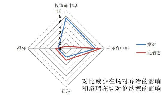 另外,在球队另一位当家球星在场与否的每36分钟数据对比中,伦纳德也是较为不依赖的那一位。威少的存在可以大幅度乔治的投篮命中率,说他俩目前的唇齿相依一点问题也没有。而伦纳德就再再再一次印证了之前的观点——他是比乔治更优秀的持球点。如果你需要一个能拉开空间并且附带一定组织属性的球员,你可以选乔治;如果你的球队缺乏稳定得分手以及关键时刻的攻坚球员,那就选伦纳德吧。
