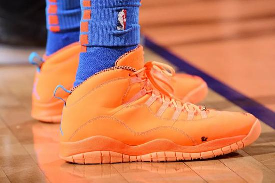 威少今天并没有继续上脚自己的签名鞋“why not”,而是选择了自己专属的“MVP”配色的AJ10。橙色的鞋面极为亮眼,蓝色的点缀更是和雷霆的色调相匹配。