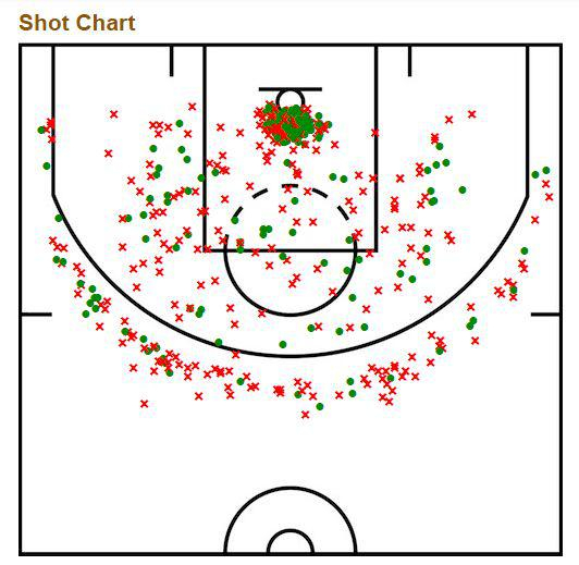 本赛季,威少的真实命中率仅有44.7%,排名联盟第277位,处在联盟中下游水准。威少的真实命中率甚至比排名第276位的马刺队后卫德里克-怀特还要低。从威少本赛季的投篮统计图上也能够看到,几乎满眼都是鲜艳的叉叉。