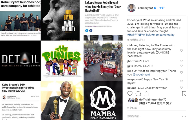 而在科比晒出的九张图片中,分别是他在过去一年中的辉煌成就,从个人公司的运营到个人书籍的出版,再到科比《细节》栏目的推出,包括科比还荣获了奥斯卡的大奖,成为2019年男篮世界杯的形象代言人。从职业球员的优秀到退役后的人生赢家,科比的年终收获总让人们羡慕。