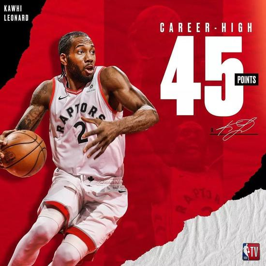 新年的第一天,在多伦多的加拿大航线中心体育馆里,MVP的呼喊声到达了顶峰。和犹他爵士的比赛,终场前的6秒,科怀·伦纳德走上罚球线,得到了本场比赛的第45分,生涯新高,猛龙获得了胜利,为新的一年开了个好头。